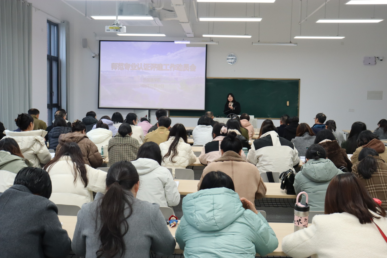 会上,李静介绍了师范专业认证的宗旨、目的、基本理念、考查指标及认证意义。李静进一步阐述了师范专业认证基本理念、考查指标及认证意义。她强调,认证重视师范教育的全面性、实践性和创新性,旨在通过严格的考查指标,全面提升英语师范教育的整体水平。最后,李静宣布成立外国语学院师范专业认证领导组,下分各专项小组,大家对标对表,提高执行力,把大事做好,把小事做细,把细节做精。