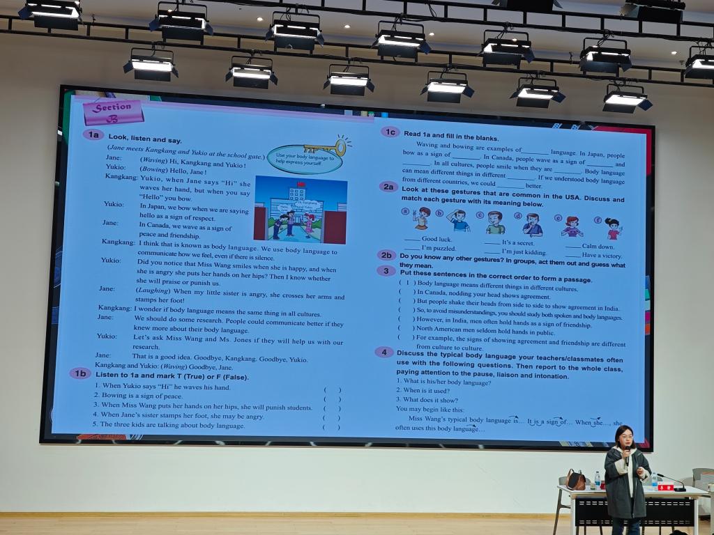 李文爽老师围绕“研读教材,明其逻辑”“分析课例,巧妙设计”“说课讲课,并非同一”三个板块展开分享。她详细解读旧版仁爱教材结构,并梳理各年级核心主题,如七年级“结交新朋友”“学校生活”,八年级“运动健康”“情绪调节”,九年级“全球英语”等,特别强调八年级是初中关键期,需兼顾学生心理关怀与知识教学。接下来,以九年级上册Unit 3 Topic 2 English Around the World听说课为例,拆解教学设计要点,通过创设文化冲突场景、融入信息技术、设计有效教学活动,激发学生兴趣,培养跨文化意识;同时提醒师范生,教学设计需避免套用模板,要融入个人思考,可通过设计项目式、探究式活动,让课堂更生动。
