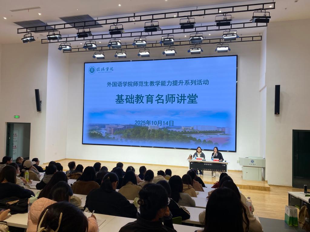 为助力师范生提前衔接中学英语教学实际、夯实教学实践与课堂管理能力,外国语学院于南湖校区教一楼112报告厅举办师范生教学能力提升系列活动之基础教育名师讲堂。本次讲座特邀信阳市羊山中学高级教师陈冉、信阳市第九中学优秀教师李文爽担任主讲人,外国语学院院长罗德喜、党总支副书记程娇炎、教学副院长李静、行政干事梁书荣、教学干事李达及师范专业学生代表共同参与,讲座由李静主持。